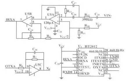 該芯片是專(zhuān)門(mén)為HART儀器設(shè)計(jì)的。符合Bell202標(biāo)準(zhǔn)的調(diào)制器、解調(diào)器、時(shí)鐘和定時(shí)電路以及檢測(cè)控制電路集成在芯片上,性?xún)r(jià)比相對(duì)較高。AD421是一款單芯片高性能數(shù)模轉(zhuǎn)換器,主要由穩(wěn)壓器、數(shù)模轉(zhuǎn)換器和電流放大器組成。AD421由外部4 ~ 20ma環(huán)路主電源供電,為其他器件提供3.0V電源電壓。AD421通過(guò)串行接口接收現(xiàn)場(chǎng)儀表中單片機(jī)傳輸?shù)臄?shù)字信號(hào),并將其轉(zhuǎn)換為4 ~ 20 ma電流。HT2012從VIN節(jié)點(diǎn)接收疊加在4 ~ 20mA環(huán)路上的信號(hào),經(jīng)過(guò)帶通濾波和放大后進(jìn)行載波檢測(cè)。