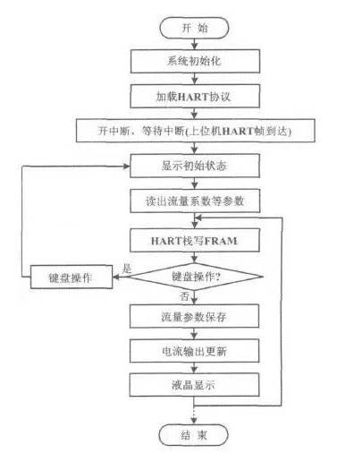 該測(cè)量系統(tǒng)的軟件開(kāi)發(fā)平臺(tái)采用KeiluVision3,編程采用C語(yǔ)言。單片機(jī)上電后,首先執(zhí)行初始化,加載并中斷HART協(xié)議,等待上位機(jī)的HART幀到達(dá),讀取鐵電存儲(chǔ)器的數(shù)據(jù),按鍵執(zhí)行鍵盤(pán)操作;如果沒(méi)有按鍵,總累計(jì)流量、瞬時(shí)流量、單次累計(jì)流量和溫度的顯示將定期刷新。